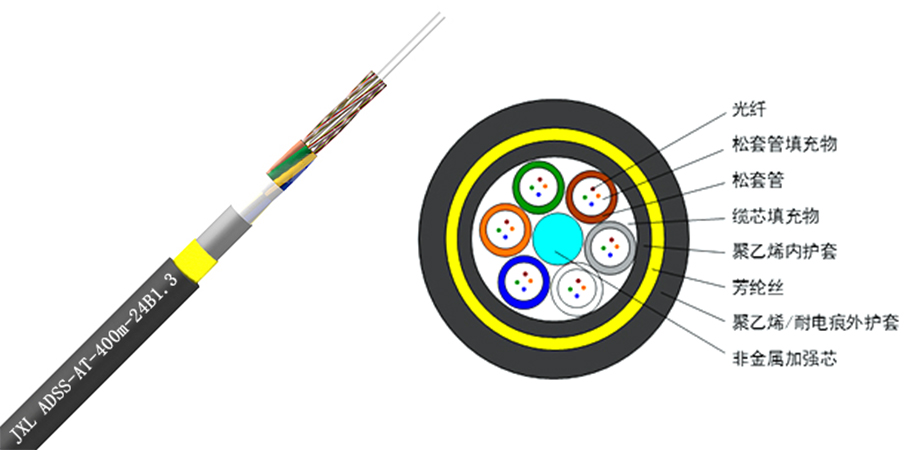 ADSS光缆采用松套层绞式结构,将250μm光纤套入高模量材料制成的松套管中,松套管内填充防水化合物。松套管(和填充绳)围绕非金属中心加强芯(FRP)绞合成紧凑的缆芯,缆芯的缝隙充以阻水油膏。缆芯外挤制聚乙烯(PE)内护套,然后绞合起加强作用的芳纶,最后挤制聚乙烯(PE)外护套或耐电痕(AT)外护套。