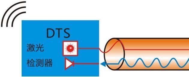 在感温光纤中注入一定能量和宽度的激光脉冲,激光脉冲在感温光纤中传输的同时不断产生背向散射光,这些背向散射光其中拉曼散射光的状态受到所在光纤散射点的温度影响而有所改变,将散射回来的光波经波分复用、检测解调后,送入数据处理系统便可将温度信号实时显示出来。