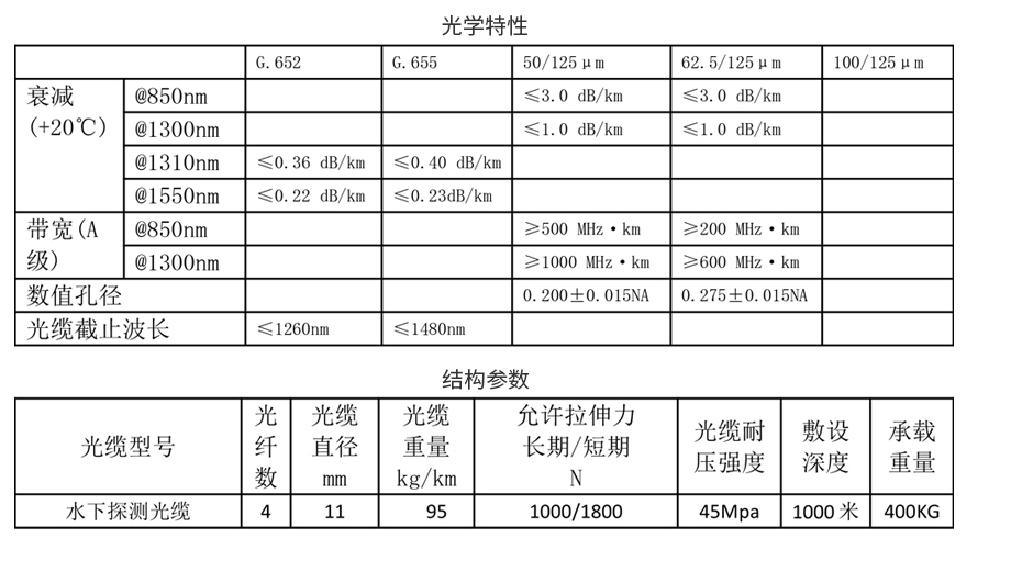 水下探测铠装光缆实用新型整体结构简单,功能可靠,可克服自重而浮于水面,并且具有良好的防水性能,长期使用缆芯间不产生错位、扭绞及变形,完全可以满足水下探测或水下机器人在水下长期工作时的需要。水下探测铠装光缆广泛应用于水下及海底探测。