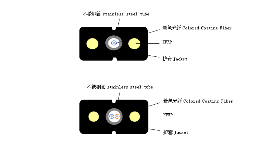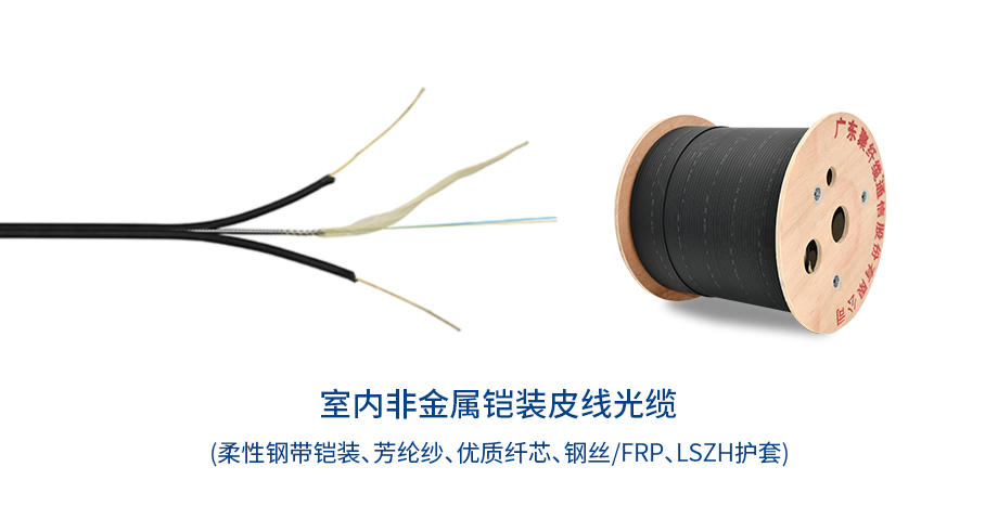 室内铠装皮线光缆,或称室内蝶形铠装光缆,这款产品的结构是柔性钢带铠装内包裹着芳纶纱和纤芯外,再在外面挤制一层低烟无卤LZSH胶料/PVC胶料(呈蝶形结构),两边各有一对平行钢丝/非金属FRP作加强原件。室外类型的铠装皮线,可在侧面加多一个自承式的大钢丝作为加强原件。