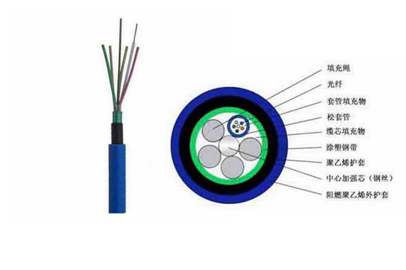 层绞式: 由内到外依次为中心加强件(一般用磷化钢丝),光纤,光纤膏,松套管,扎带,缆膏,钢带,PE内护层,阻燃护套(蓝色)