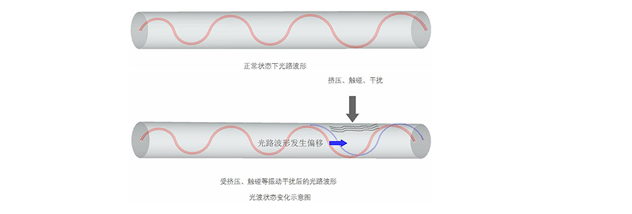 振动光纤则当光纤受到振动时,光纤中传输光的部分特性就会改变,通过配置特殊的感测设备,经过信号采集与分析,就能检测光的特性(即衰减、相位、波长、极化、模场分布和传播时间)变化。光的特性变化通过报警控制器的特殊算法和分析处理,区分第三方入侵行为与正常干扰,实现报警及定位功能。