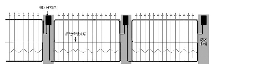 在铁艺围栏上铺设光缆时,由于铁艺较硬,应增加振动传感光缆的数量以保证能可靠地感应到入侵信号。通过分析入侵者翻越围栏的动作特点,建议沿铁艺围栏最顶端、中间和最底端的水平铁栏杆各铺设一道振动传感光缆。