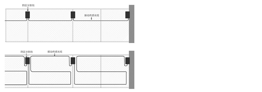 (2)凿墙安装时,施工人员可采用平行线型方式在墙面上铺设两道光缆,围墙的高度不应超过2米,光缆应固定在距离地面0.5米和1.5米处,如果围墙高度大于2米,则高度每增加1米,需增加一道光缆,光缆水平固定在该区域的中部。为了保证振动传感光缆能感应到凿墙时产生的振动,必须保证墙面结实,砖块不能有松动,并且光缆应紧密地附着在围墙表面,可使用线卡子每隔50cm进行固定。