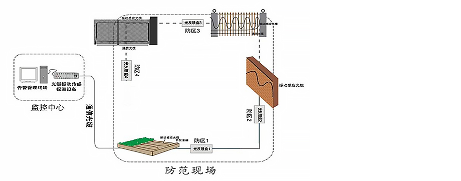 激光器发出直流单色光波,光信号通过光缆经过光学模块使光信号产生两道干涉信号,信号利用光纤作为振动传感载体,实现防护预警探测,当有人非法入侵,光波信号的强度高出预定报警阈值,从而产生报警信号。
